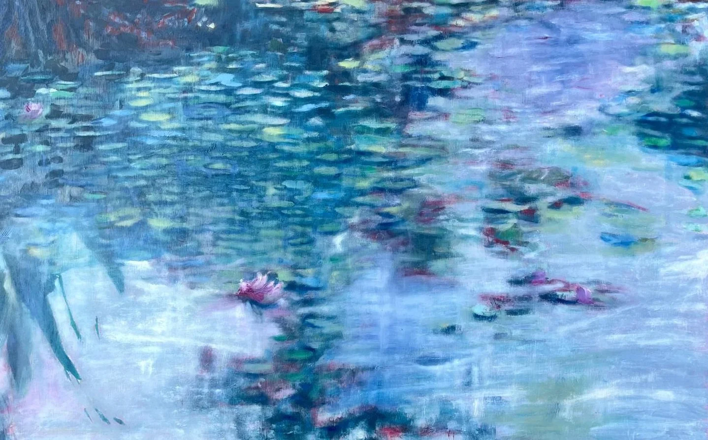 With layer upon layer of oils, I was hoping to achieve a kind of colour shifting effect but I wasn’t sure how it would turn out until it was finally complete and I took it outside… In this picture you see it (without any filters) as it appears when viewed in natural daylight. The blues, purples, and greens become more prominent. The iridescent oils add to the drama, making the work dynamic; transforming with the light.